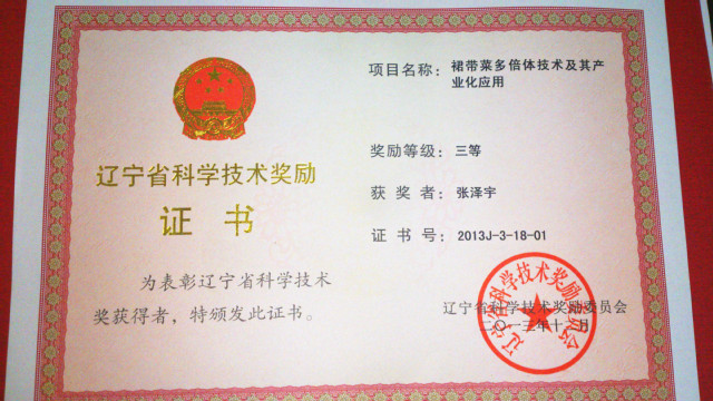 “裙带菜多倍体技术及其产业化应用”获辽宁省科学技术三等奖