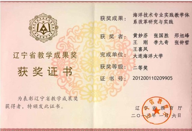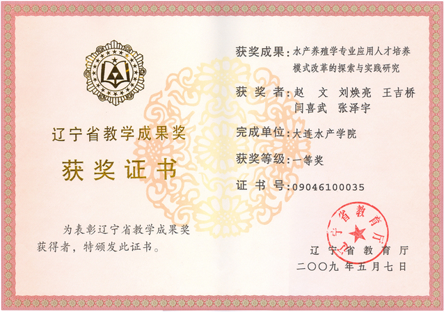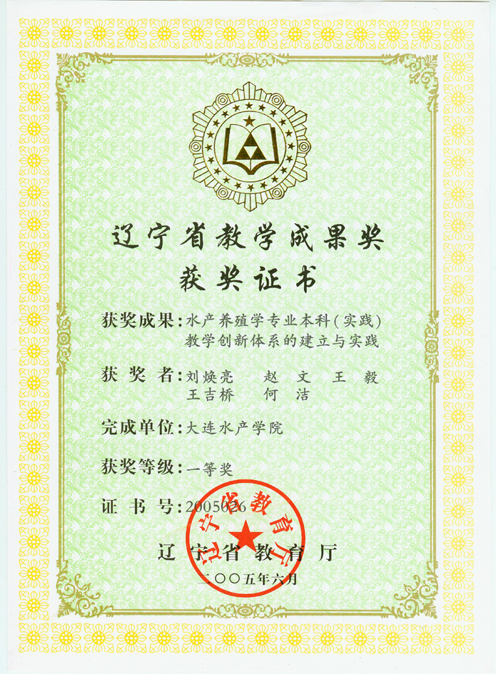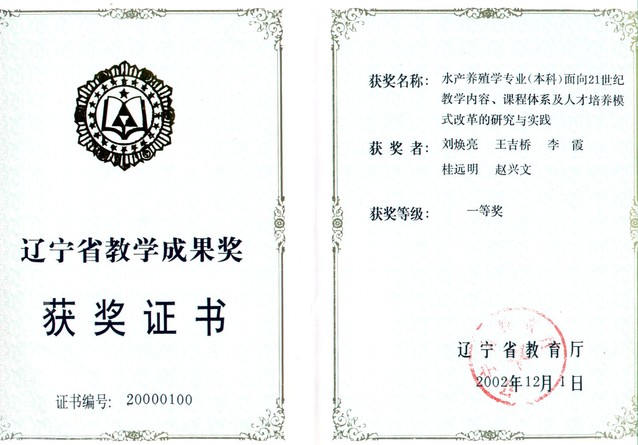 “水产养殖学专业(本科)面向21世纪教学内容、课程体系及人才培养模式改革的研究与实践”获辽宁省教学成果一等奖