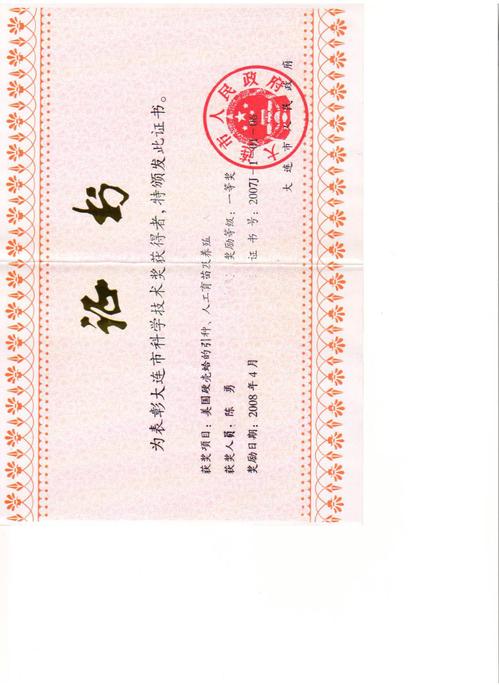 “美国硬壳蛤的引种、人工育苗及养殖”获大连市科学技术一等奖