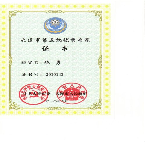 陈勇教授获“大连市第五批优秀专家证书”