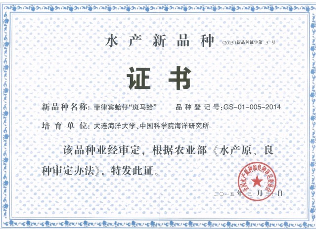 菲律宾蛤仔“白斑马蛤”通过水产新品种审定