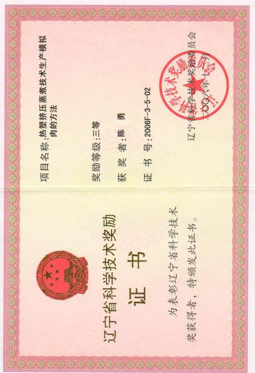 “热塑挤压蒸煮技术生产模拟肉的方法”获辽宁省科学技术三等奖