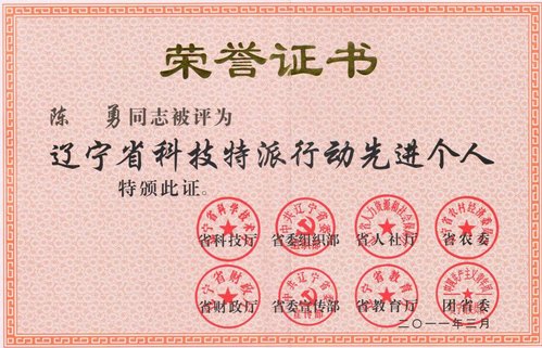 陈勇教授获“辽宁省科技特派行动先进个人”