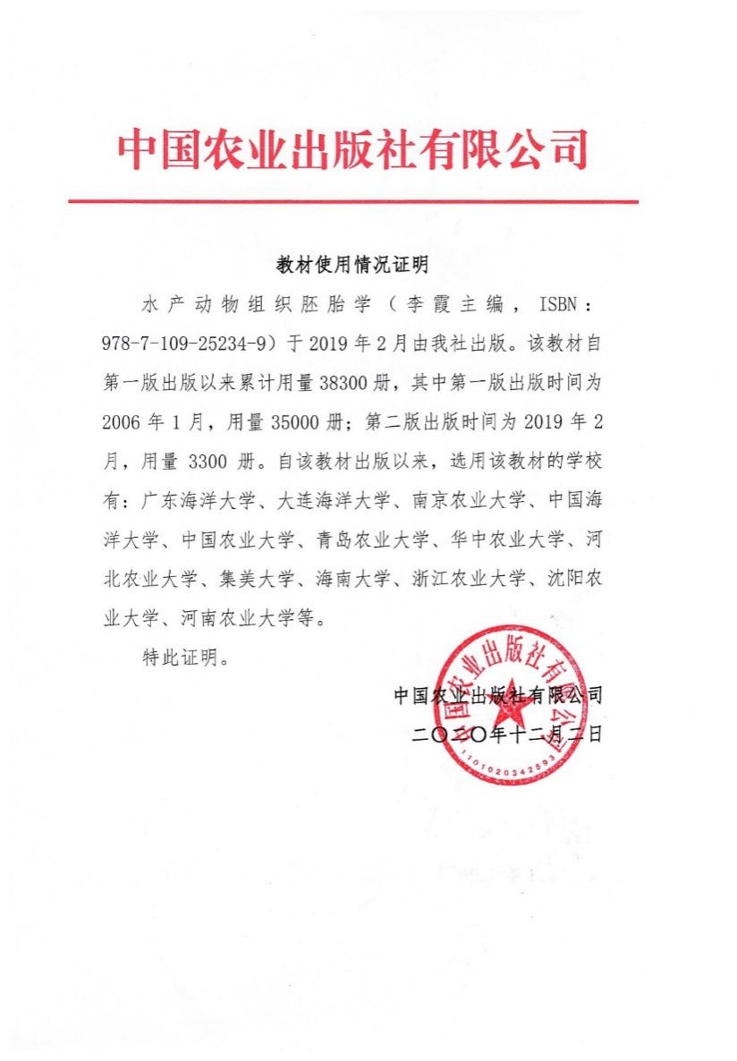 《水产动物组织胚胎学》,普通高等教育农业农村部“十三五”规划教材,全国高等农林院校“十三五”规划教材。2006年1月第一版,2019年6月第二版,李霞主编,秦艳杰参编,总印数4.2万册。于2020年12月获评“辽宁省优秀教材”。据统计,该教材在全国48所学校中使用,教材科学性强,覆盖面广。